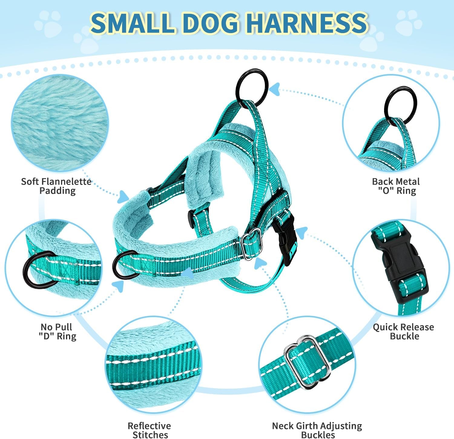 Keep your pup safe, stylish, and comfortable with our No Pull Small Dog Harness and Leash Set! This soft vest harness is made from lightweight, breathable fabric that prevents choking and evenly distributes pressure across the chest. The adjustable neck and chest straps ensure a perfect fit for small and medium dogs or puppies. Designed with a front clip for better control and an anti-twist pet lead, it makes walks easier and prevents pulling. The reflective straps enhance visibility and safety during night walks, while the durable buckle and metal D-ring offer long-lasting use. Perfect for daily walks, training, and outdoor adventures, this XXS blue harness and leash combo provides your pet with ultimate comfort, safety, and freedom to explore!