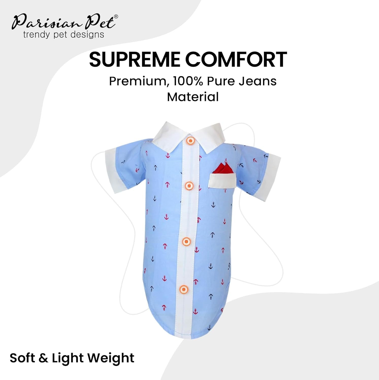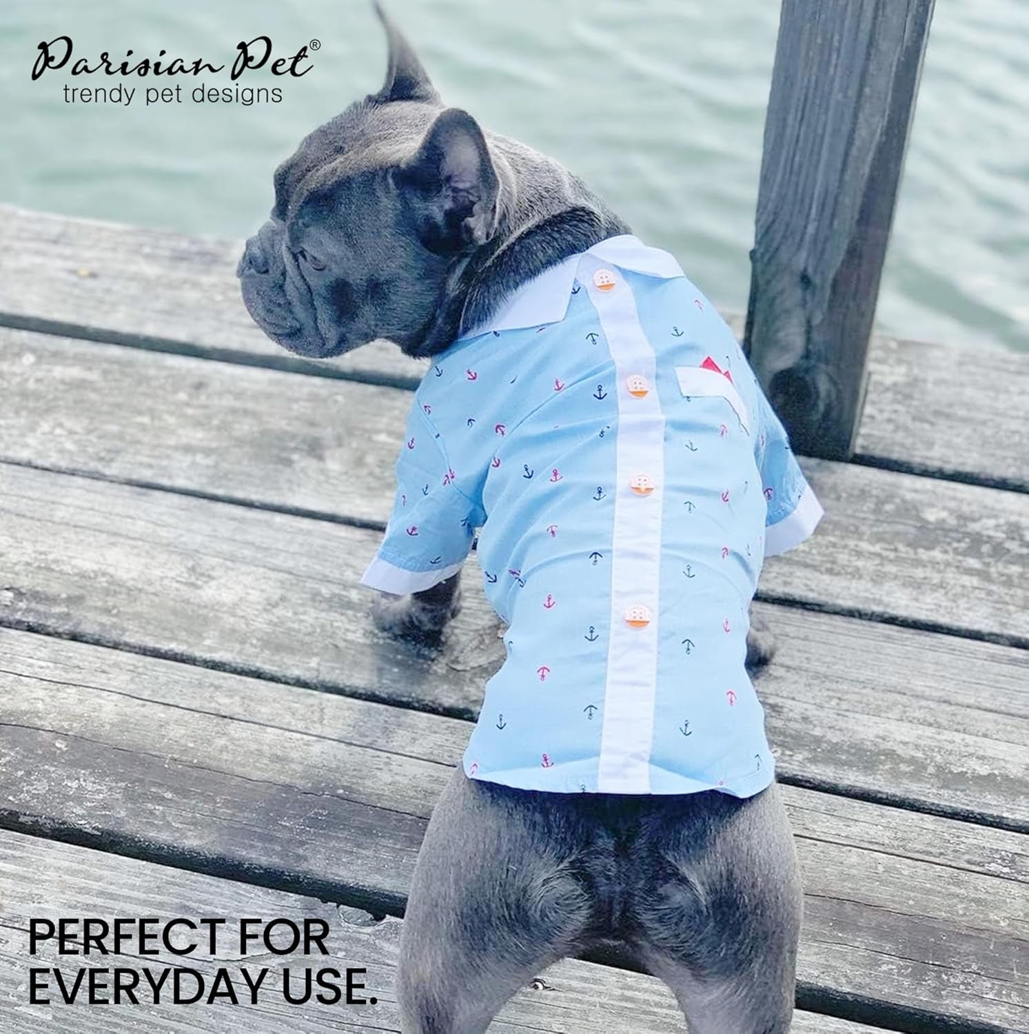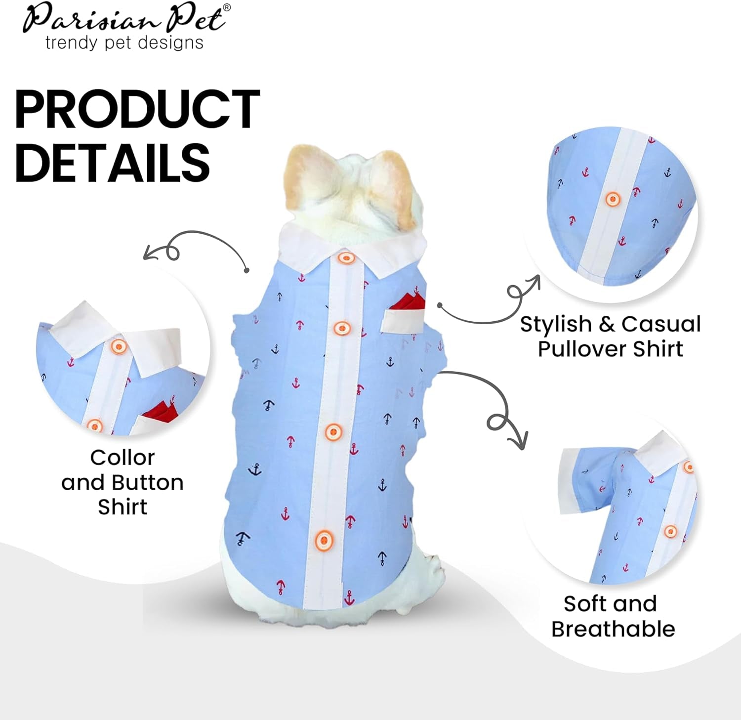 Parisian Nautical Dog Shirt, a stylish blue and white anchor costume made of 100% cotton, provides your furry friend with both comfort and fashion. This lightweight, breathable dog outfit is perfect for summer walks, beach trips, and parties. Designed for large dogs, it ensures a perfect fit and easy movement while maintaining a classic French nautical look. The soft, durable cotton fabric prevents irritation and keeps your dog cool and comfortable all day long. The anchor pattern and crisp blue-white stripes add a touch of sophistication to your pet’s wardrobe. Whether for photoshoots, special occasions, or casual outings, this Parisian-inspired pet apparel stands out for its elegance, functionality, and premium quality — making it a must-have fashion piece for every stylish dog owner.
